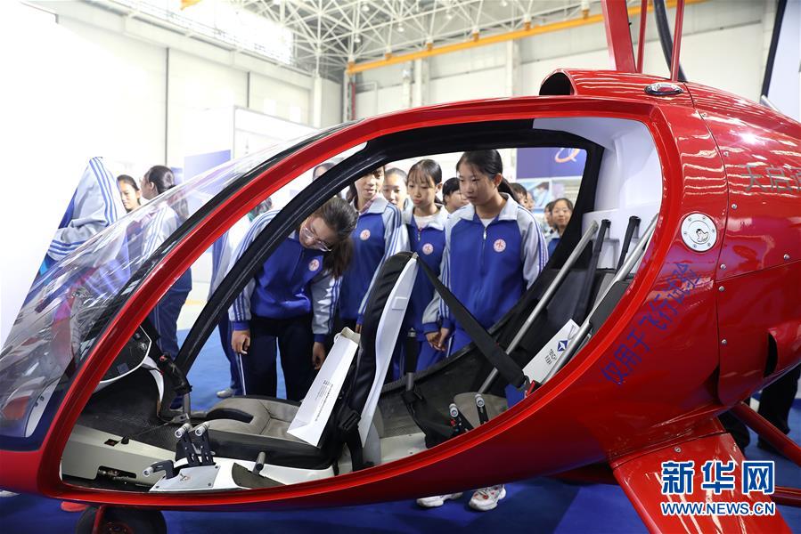 10月17日,学生在航空博览会上参观。 当日,为期4天的2019中国国际通用航空博览会在河北省石家庄市开幕。百余家国内外通用航空及配套产业企业参展,展出实用型、运动型、试验型等通用航空飞行器,展区面积近18万平方米。 新华社发(梁子栋 摄)