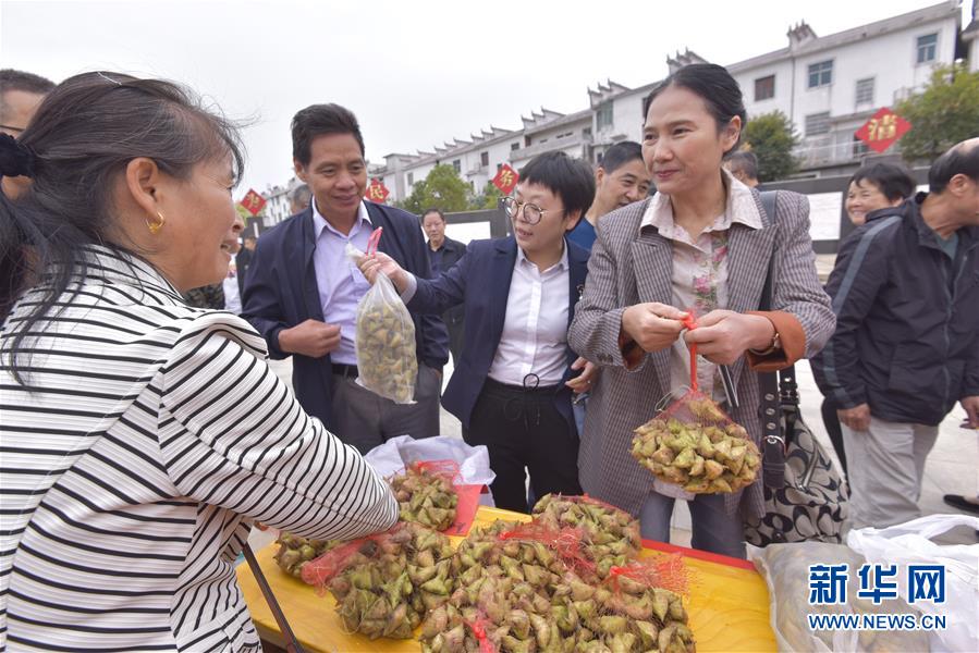 10月17日,在新干县大洋洲镇开展的扶贫日“产业、就业、健康扶贫服务活动”现场,人们在选购贫困户出售的菱角。 当日是第六个国家扶贫日,江西省新干县各乡镇组织扶贫日主题活动。 新华社发(李福孙 摄)