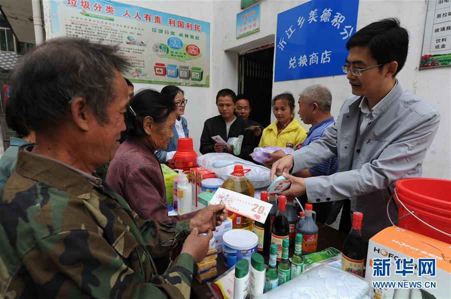 10月17日,在新干县沂江乡浒岗村委会湖尾村,贫困户用自己的“美德积分券”兑换生活用品。 当日是第六个国家扶贫日,江西省新干县各乡镇组织扶贫日主题活动。 新华社记者 冯为民 摄