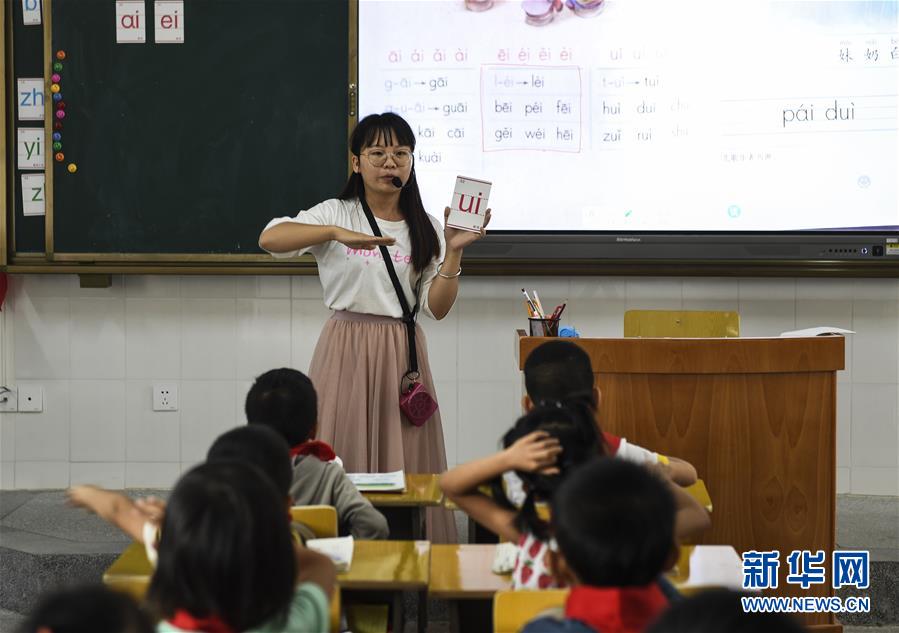 10月16日,在广西隆安县粤桂小学,老师在教一年级学生汉语拼音。2019年8月竣工交付使用的广西隆安县粤桂小学,是粤桂扶贫协作项目之一,同时也是隆安县易地扶贫搬迁震东集中安置区的配套项目之一。学校现有学生1941人,其中大部分来自易地扶贫搬迁安置新区,为扶贫安置区孩子就近上学提供了保障。新华社记者 曹祎铭 摄