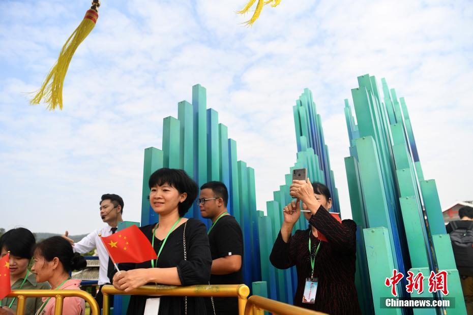 10月20日,“壮美广西”彩车亮相南宁市广西民族博物馆,吸引众多市民前往观赏。图为市民在彩车上近距离观赏。中新社记者 俞靖 摄