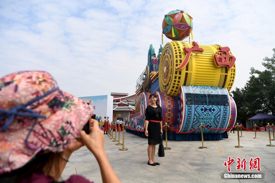 10月20日,“壮美广西”彩车亮相南宁市广西民族博物馆,吸引众多市民前往观赏。图为一市民与彩车合影。中新社记者 俞靖 摄