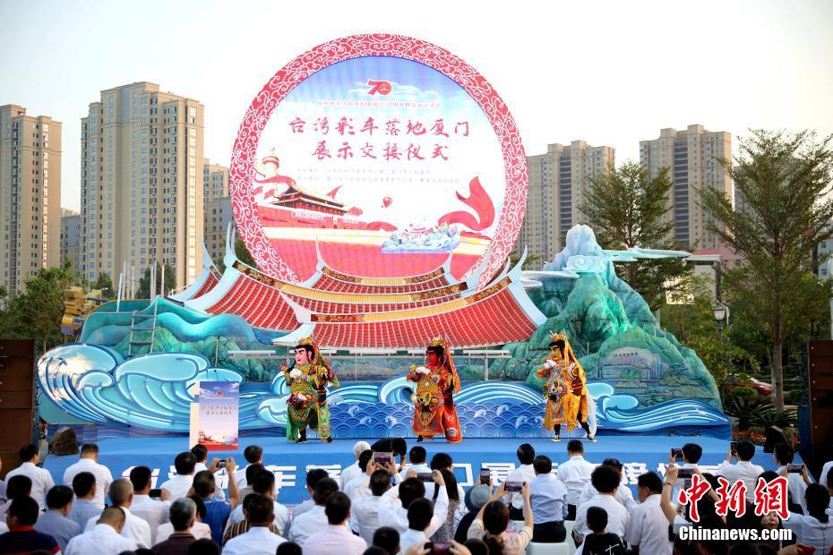 10月20日,台湾彩车落地厦门展示交接仪式在福建厦门集美新城举行。以“两岸一家亲,共圆中国梦”为主题的台湾彩车在庆祝中华人民共和国成立70周年大会群众游行“中华儿女”方阵中亮相,受到高度关注。图为电音三太子亮相交接仪式现场。中新社记者 李思源 摄