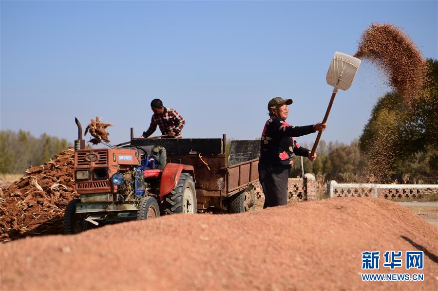 10月22日,和林格尔县新店子镇十一号村农民在晾晒高粱。 近日,地处塞北的内蒙古呼和浩特市和林格尔县天气晴好,当地农民紧抓有利农时,在降雪来临前收获晚熟作物,确保作物颗粒归仓。 新华社发(李志鹏 摄)