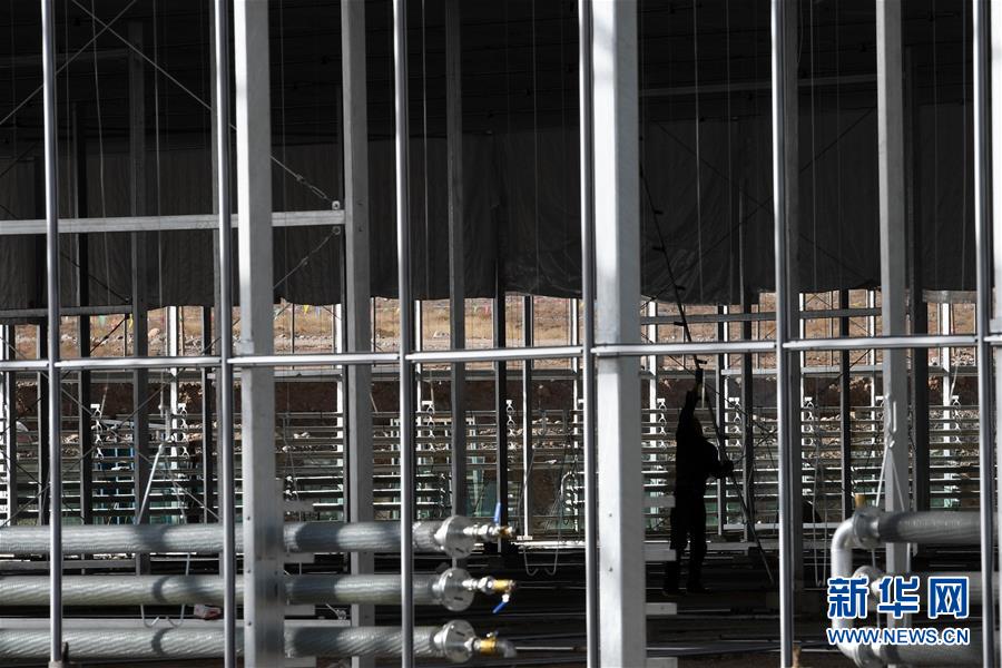 10月22日,在酒泉市肃州区东洞镇,工人在中荷智能连栋温室项目工地施工。2019年肃州区已完成戈壁农业建设面积5672亩,戈壁农业总面积达2.5万亩。 近年来,位于甘肃河西走廊的酒泉市利用戈壁光照充足、昼夜温差大等特点,大力发展戈壁农业,带动农户建设高效节水的日光温室大棚,助力农民增收致富。目前全市已建成近4万亩戈壁农业。 新华社记者 马宁 摄
