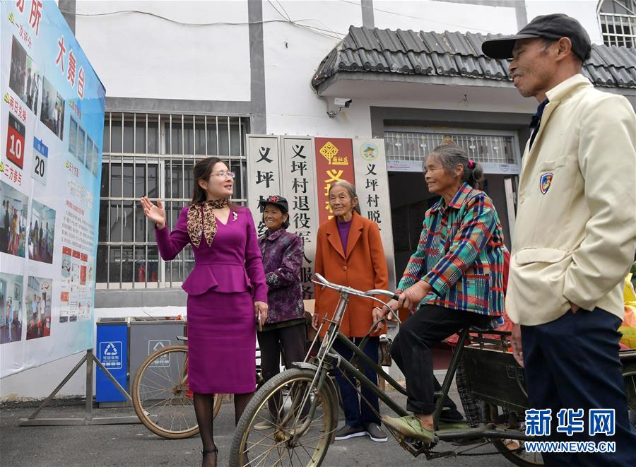 10月23日,在南昌市湾里区罗亭镇义坪村的“脱贫动力加油站”,驻村第一书记杨美蓉(左一)在向村民介绍“脱贫动力加油站”的积分兑换规则。