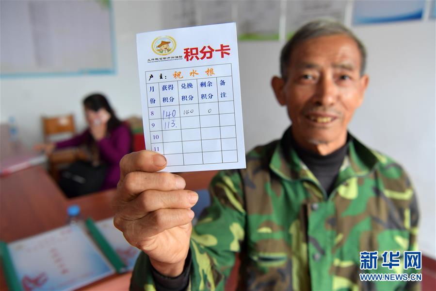 10月23日,在南昌市湾里区罗亭镇义坪村的“脱贫动力加油站”,村民展示他的积分卡。新华社记者 彭昭之 摄