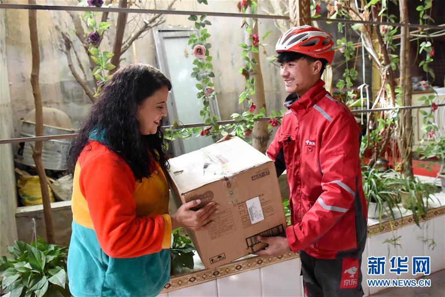 在新疆疏勒县疏勒镇,快递员安外尔·艾合麦提为客户送货(10月18日摄)。 新华社记者 丁磊 摄