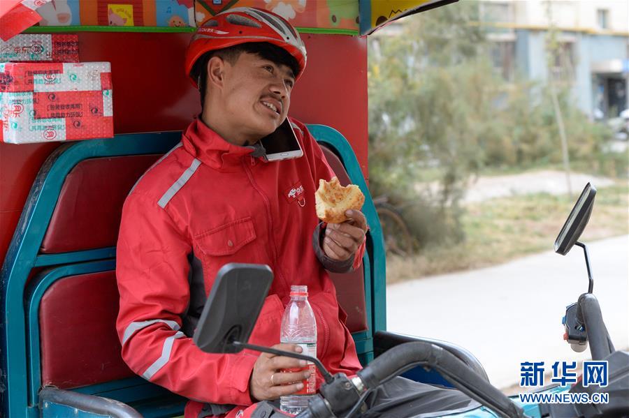 快递员安外尔·艾合麦提在送货间隙联系顾客(10月18日摄)。 新华社记者 丁磊 摄