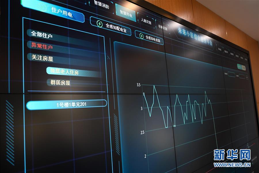 德慧公寓“未来小区”综合服务平台大屏幕显示的用电安全系统(10月23日摄)。系统通过用电在线大数据分析,可以预警独居老人及群居房屋的生活用电安全。 近日,浙江省杭州市萧山区以德慧公寓安置房为试点的首个“未来小区”完成建设,静待居民入住。据了解,这个“未来小区”利用物联网技术对视频监控设备、物联网传感终端设备、社区用电设备等进行集中管理,集成智慧用电、智慧消防、人脸识别、车辆识别、充电桩、智慧灯杆、智慧物业等功能,以提升社区的物业服务水平。 新华社记者 黄宗治 摄