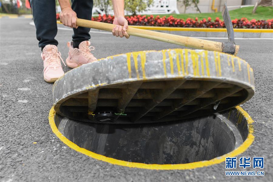 10月23日,德慧公寓物业人员展示使用物联网技术的智能井盖。当井盖在发生位移、倾斜、溢水、损坏时,传感设备会立刻将报警信息推送给物业管理人员。 近日,浙江省杭州市萧山区以德慧公寓安置房为试点的首个“未来小区”完成建设,静待居民入住。据了解,这个“未来小区”利用物联网技术对视频监控设备、物联网传感终端设备、社区用电设备等进行集中管理,集成智慧用电、智慧消防、人脸识别、车辆识别、充电桩、智慧灯杆、智慧物业等功能,以提升社区的物业服务水平。 新华社记者 黄宗治 摄
