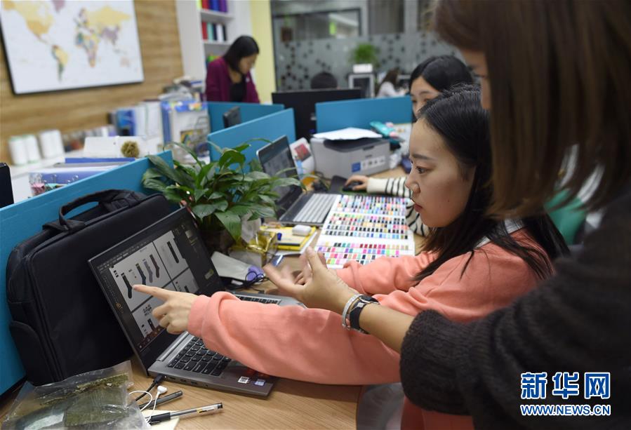 10月23日,诸暨市大唐街道一家制袜企业的设计人员通过企业内部数据平台商讨个性化定制方案。新华社记者 韩传号 摄