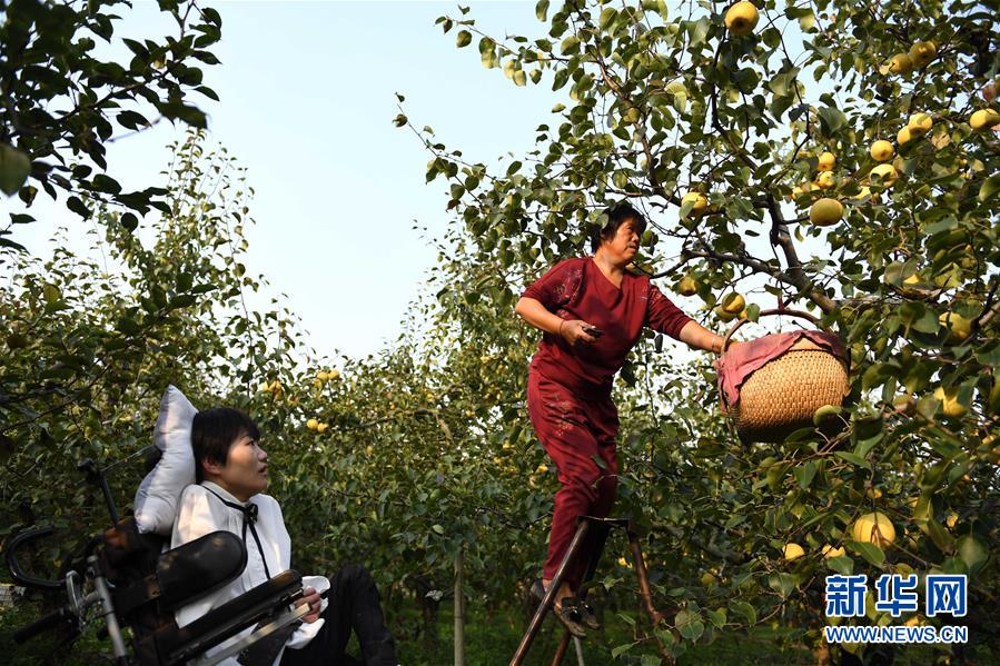 10月23日,李娟在自家梨园里看妈妈采摘酥梨。 新华社记者刘军喜摄