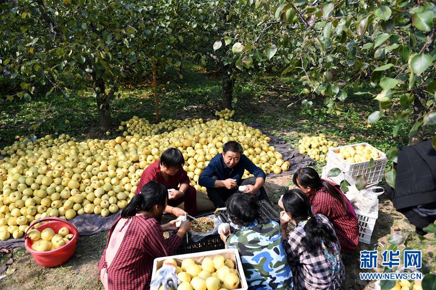 10月23日,李娟的父亲李祥玲(上右)和村民们一起在梨园吃午饭。 新华社记者张端摄