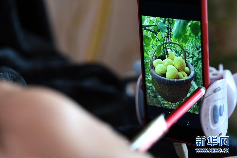 10月23日,李娟在家中通过手机发布梨园的相关图片信息。 新华社记者刘军喜摄