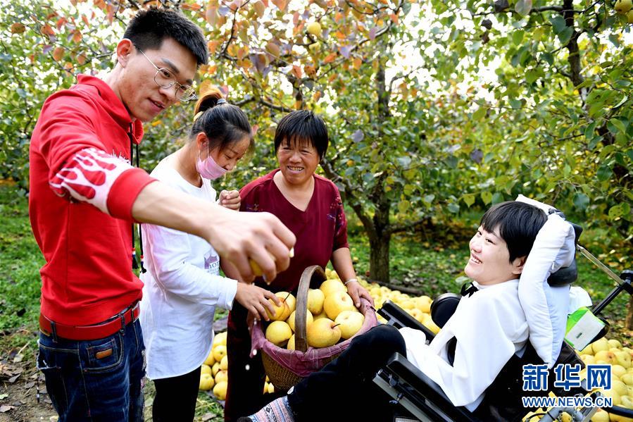 10月23日,李娟和家人在自家梨园里。新华社记者张端摄