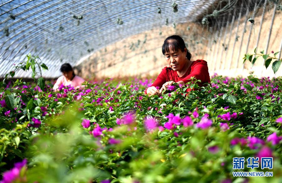 10月27日,在固安县盛世农合生态农业园鲜花种植基地,工作人员在查看三角梅长势。 近年来,河北省固安县积极调整农业产业结构,瞄准京津花卉市场需求,大力发展“鲜花经济”,建立集种植、储运、销售为一体的产业链,带动农民增收,助力乡村振兴。 新华社记者王晓摄
