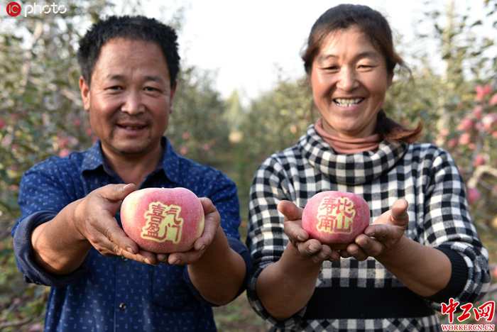 中工网讯 2019年10月30日,在山东省日照市莒县寨里河镇后牛店村苹果园,马先念和妻子王兴翠在展示他们种出的“艺术苹果”。9年前,他们曾经种了七八年的大棚蔬菜,后来因为赔本转行种苹果,如今夫妻俩辛辛苦苦的经营着十几亩果园,日子越过越好。