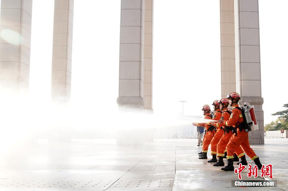 11月4日,中国国家博物馆在北京举行消防安全综合演练活动。此次演练分为消防专业知识培训授课、模拟火场逃生演练、消防技能训练展示、模拟消防灭火演练和领导点评五个部分。图为消防人员演示使用消防设备。中新社记者 张兴龙 摄