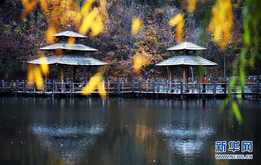 11月4日,游客在济南南部山区的九如山游览。 深秋时节,济南南部山区呈现出红、黄、绿等不同色彩,“绘”成一幅美丽的泉城秋色图。 新华社记者 王凯 摄