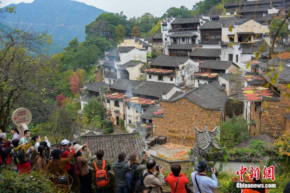 11月8日,游客在江西省婺源县篁岭古村内观光、拍照。当日是立冬节气,古村家家户户趁着晴好天气晒出辣椒、玉米等秋收作物。中新社发 方华彬 摄