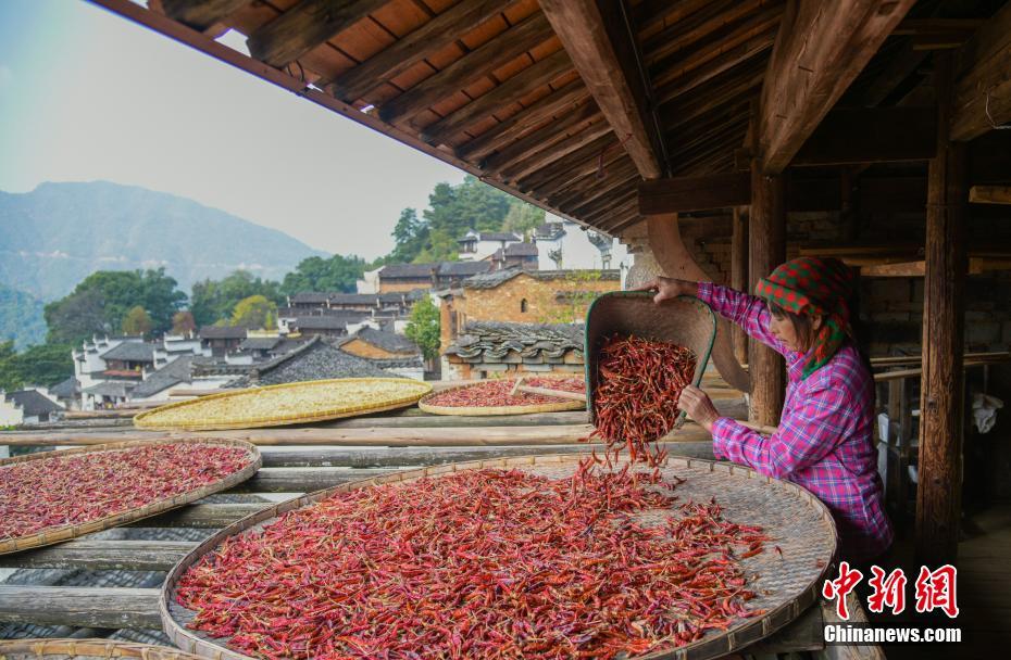 11月8日,游客在江西省婺源县篁岭古村内观光、拍照。当日是立冬节气,古村家家户户趁着晴好天气晒出辣椒、玉米等秋收作物。中新社发 方华彬 摄