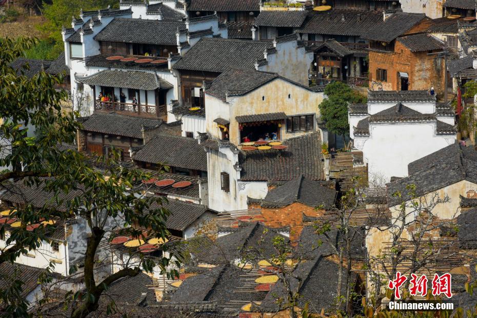 11月8日,游客在江西省婺源县篁岭古村内观光、拍照。当日是立冬节气,古村家家户户趁着晴好天气晒出辣椒、玉米等秋收作物。中新社发 方华彬 摄
