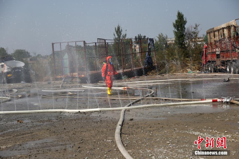 事故发生后,当地消防、应急局、环保局、120等应急联动部门赶到现场开展联动处置。图为事故现场。陆之胆 摄