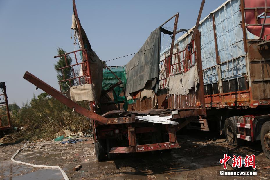 至当天中午,事故现场处置完毕,事故造成运输罐车解体,停车场内多辆车不同程度损伤,无人员伤亡,事故原因正在进一步调查中。 图为受损的车辆。陆之胆 摄