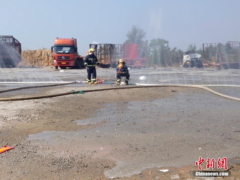 11月8日上午,广西钦州市钦州港区港煌停车场一辆载有31吨双氧水的运输罐车发生泄漏,并引燃附近草丛。图为消防员现场处置。陆之胆 摄