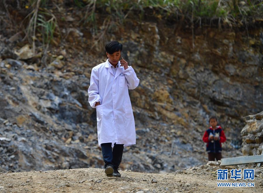在大化瑶族自治县七百弄乡弄雄村七百弄鸡养殖场,蓝志平在打电话联系市场(11月10日摄)。新华社记者 黄孝邦 摄