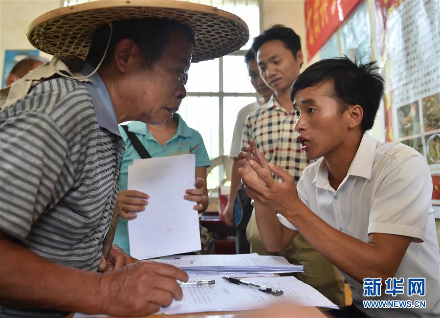 在大化瑶族自治县七百弄乡弄雄村,蓝志平(右一)在七百弄鸡养殖产业发展动员会上解答群众的疑问(2016年8月17日摄)。新华社记者 黄孝邦 摄