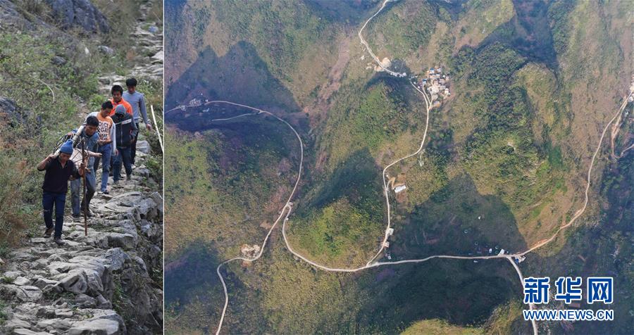 拼版照片:左图为在尚未通路的弄雄村弄桃屯,村民抬着准备出售的土猪走在山路上(2016年12月8日摄);右图为已经通路的弄雄村弄桃屯以及周边村屯(11月10日无人机拍摄)。新华社记者 黄孝邦 摄