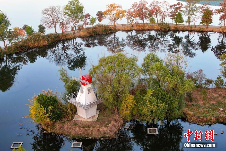 11月11日清晨,航拍古都南京紫金山前湖段,色彩交织的树木、静谧的湖水、雄伟的明城墙,充满诗情画意。中新社记者 泱波 摄