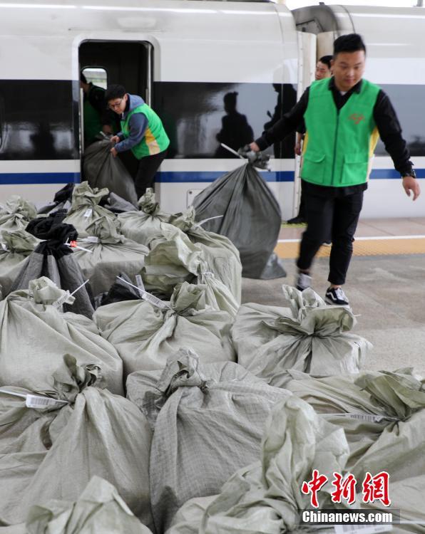 11月12日,在南昌西站,中铁快运南昌分公司工作人员和南铁青年志愿者将G1462次高铁上的157袋快递包裹卸到站台
