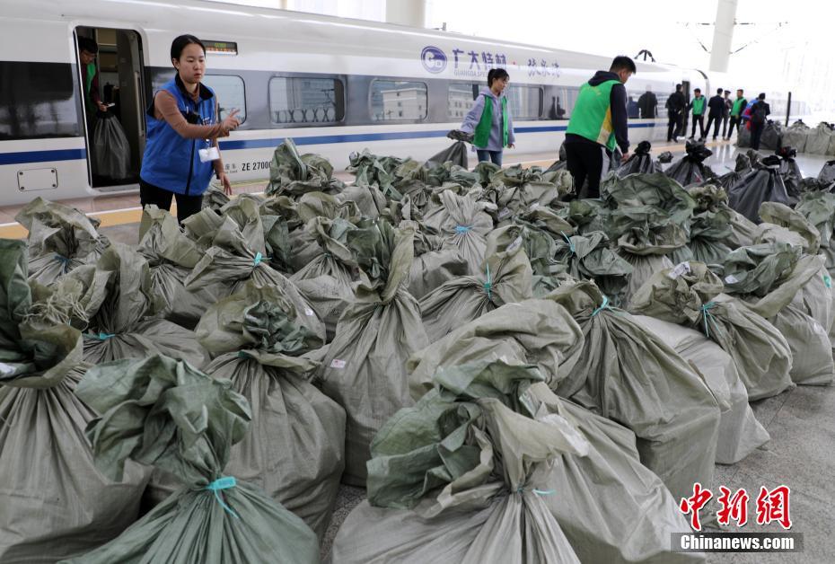 11月12日,在南昌西站,中铁快运南昌分公司工作人员和南铁青年志愿者将G1462次高铁上的1快递包裹送到站台上并进行装车。胡国林 摄