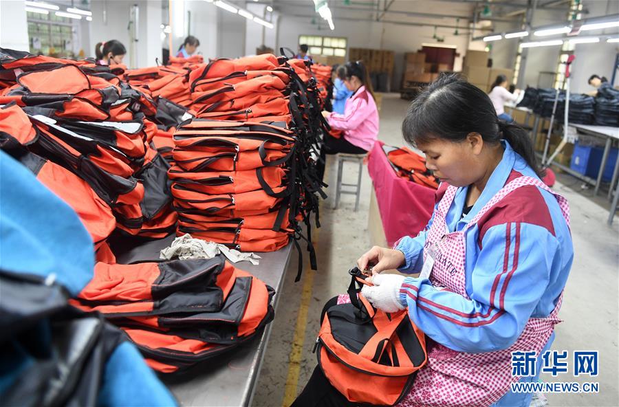 11月13日,工人在广西贺州市平桂区一家“扶贫车间”工作。 2018年6月,广西贺州市平桂区引进加工企业在易地扶贫搬迁安置点附近建设“扶贫车间”,主要从事箱包生产,产品销往欧美等地。目前,这个“扶贫车间”有工人268人,其中贫困人员89人,不但帮助安置点的贫困群众就业增收,还给附近居民带来了就业机会。 新华社记者 陆波岸 摄