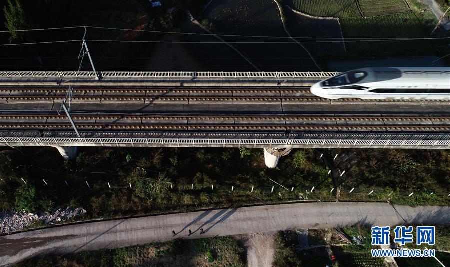 11月14日,贵州凯里南车站派出所民警对沪昆高铁沿线重点桥梁进行巡逻(无人机拍摄)。 在贵州铁路部门开展的高铁环境安全隐患集中整治中,贵州凯里车务段、凯里南车站派出所等部门合力共为,与地方协调联动,对境内沪昆高铁沿线违法建筑、违法施工、私搭乱建、乱排乱放等隐患进行排查整治,提升高铁沿线群众的铁路安全意识,力保高铁列车运行安全。 新华社记者 杨文斌 摄