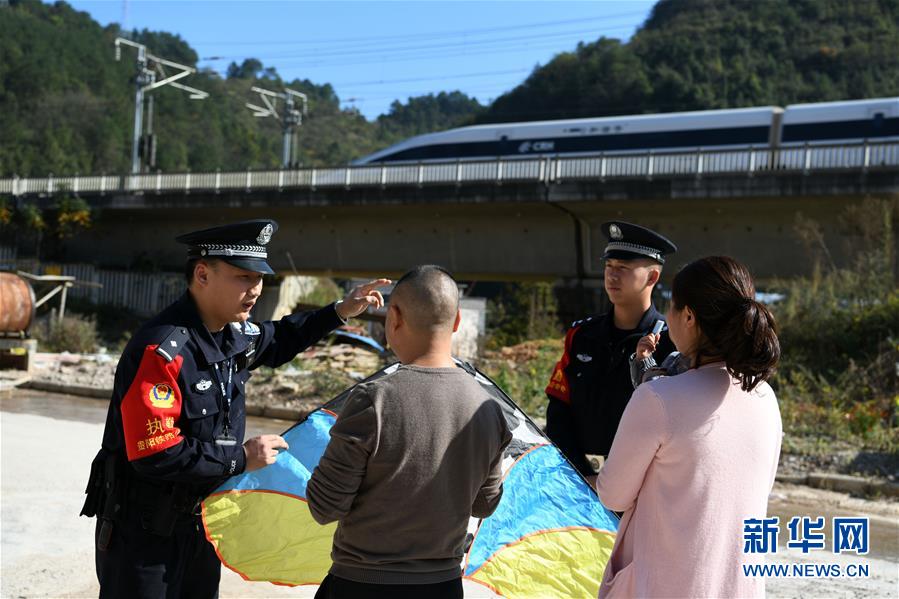 11月14日,贵州凯里南车站派出所民警对沪昆高铁沿线民众进行铁路安全知识宣传。 在贵州铁路部门开展的高铁环境安全隐患集中整治中,贵州凯里车务段、凯里南车站派出所等部门合力共为,与地方协调联动,对境内沪昆高铁沿线违法建筑、违法施工、私搭乱建、乱排乱放等隐患进行排查整治,提升高铁沿线群众的铁路安全意识,力保高铁列车运行安全。 新华社记者 杨文斌 摄
