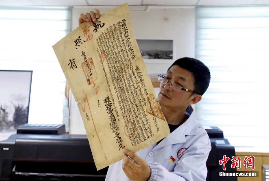 11月14日,青海西宁,青海省档案馆的文物复仿制师邢建与徒弟正为珍贵档案的仿真复制工作忙碌。2009年起,计算机专业毕业的邢建主动承担起该档案馆仿真复制工作,他摸索归纳出了破碎法、描边法、仿旧法等仿真复制方法,不仅保护了档案“原件”,也使其发挥了更充分的使用价值。图为邢建查看运用破碎法完成的仿真复制档案作品。中新社记者 马铭言 摄