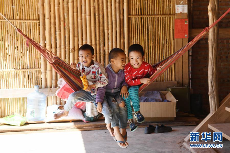 11月16日,云南勐腊县勐伴镇河边村民小组的几名小孩在家门口玩耍。 新华社记者杨宗友摄