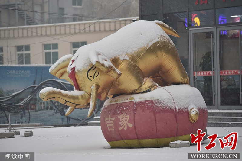 2019年11月17日,沈阳,在康平县街头,一商场前庆典用的充气“大象”被雪“压的”地下了头。