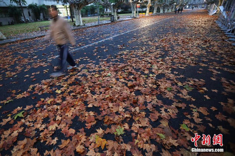 南京迎降温 落叶缤纷铺“地毯”
