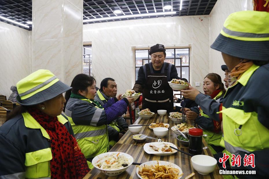 11月19日,窦新功为环卫工人们端来免费面食。2008年,窦新功与妻子在西宁开了一家面馆,由于自己从小家境不好,2010年开店成功后,窦新功与妻子决定邀请环卫工人到店里免费吃面,为环卫工人送去一份温暖和关爱,这一坚持,已将近10年;不仅如此,今年以来,面馆所在辖区的低保户、残疾人、家庭贫困的老人到店里用餐同样也免费。中新社记者 马铭言 摄