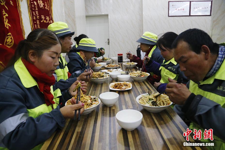 11月19日,环卫工人们聚集在面馆内吃免费面食。2008年,窦新功与妻子在西宁开了一家面馆,由于自己从小家境不好,2010年开店成功后,窦新功与妻子决定邀请环卫工人到店里免费吃面,为环卫工人送去一份温暖和关爱,这一坚持,已将近10年;不仅如此,今年以来,面馆所在辖区的低保户、残疾人、家庭贫困的老人到店里用餐同样也免费。中新社记者 马铭言 摄