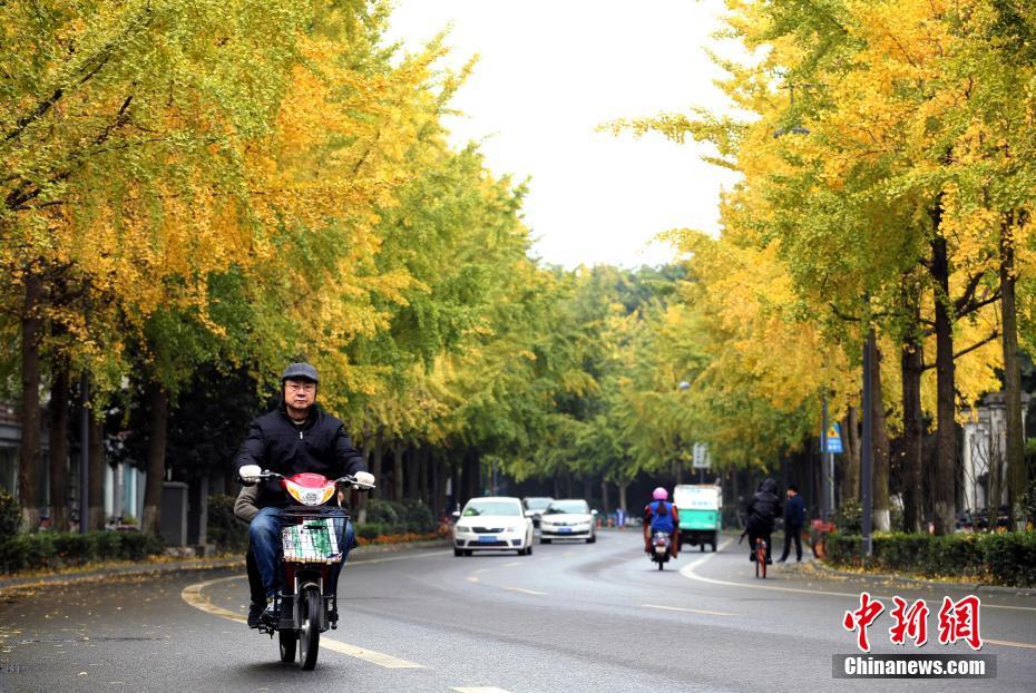 11月20日,一名市民在成都街头骑行。初冬时节,随着天气转冷,成都街头的银杏树叶渐渐变成金黄。中新社记者 王磊 摄