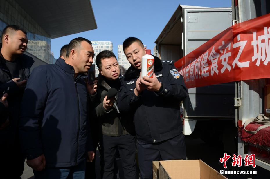 11月20日,执法人员讲解假贵州茅台酒的特征。当日,由内蒙古自治区市场监督管理局、呼和浩特市市场监督管理局承办的食品安全问题整治行动违法物品销毁活动在呼和浩特市国际会展中心举行。2019年前三季度,内蒙古自治区市场监管系统通过一般程序立案查处食品、保健食品等各类案件3787件,涉案货值1389.7万元人民币,罚没合计0.53亿元人民币,罚没物品合计60余吨,责令停产停业13家,吊销许可证2张,涉嫌犯罪移送司法机关17起。中新社记者 刘文华 摄