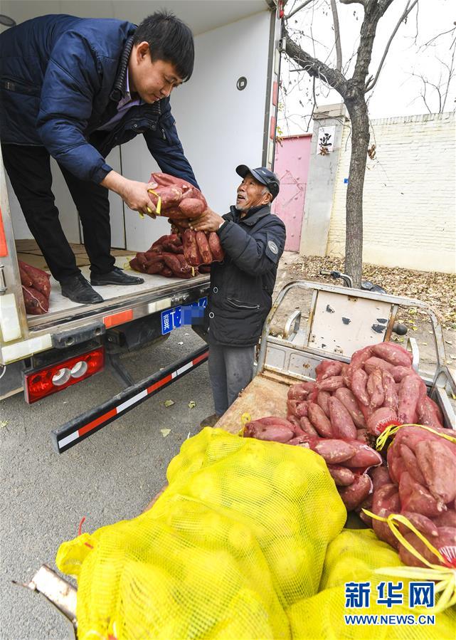 11月21日,在河北省故城县饶阳店镇宋庄村,一家农商通公司进村收购贫困户杨金左(右)种植的红薯。 近年来,河北省故城县扶持打造“农商通”“扶贫馆”“创新港”三大电商平台,创新“扶贫合作社生产加工+电商平台线上营销+村级服务站线下代销+社会各界人士亲情推广”“四位一体”消费扶贫模式,除日常销售产品外,注重推广贫困户种植的农产品,带动90多户贫困户增收。 新华社记者 李晓果 摄