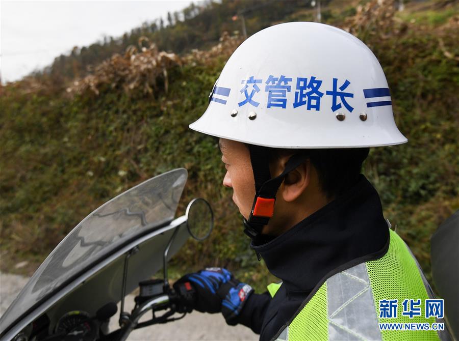 长阳土家族自治县公安局农村交管路长聂华盖在长阳贺家坪镇的乡村道路上巡逻(11月21日摄)。 湖北宜昌市长阳土家族自治县地处鄂西南武陵山区,辖区道路临水临崖,坡陡弯急。2016年底,长阳土家族自治县在当地率先推行“路长制”,要求每个乡镇招聘2至3名专职路长,负责农村道路交通秩序维护、入户安全宣传、村民红白喜事用车报告、学生上下学时段交通管理、排查道路安全隐患等职责,以实现每条乡村主干道安全监管全覆盖。2017年以来,“路长制”在宜昌市全面推广,招录农村路长376名,每3至4个村配备1名路长。因推行“路长制”,当地农村群众交通安全意识、守法意识大幅提高。 新华社记者 陈晔华 摄