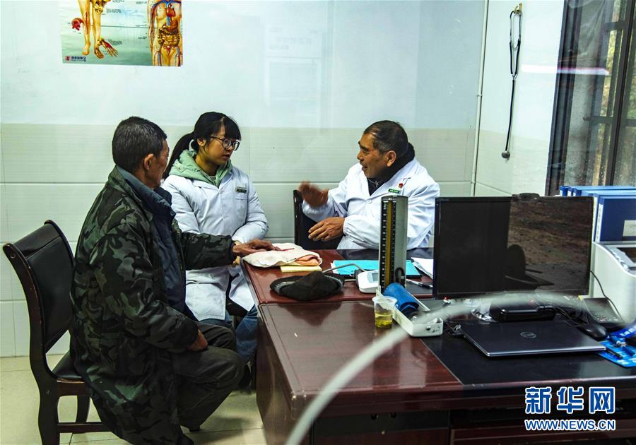 11月24日,大学生村医杨海燕(中)与村医裴光鑫一起为村民看病。 新华社记者 杜华举 摄